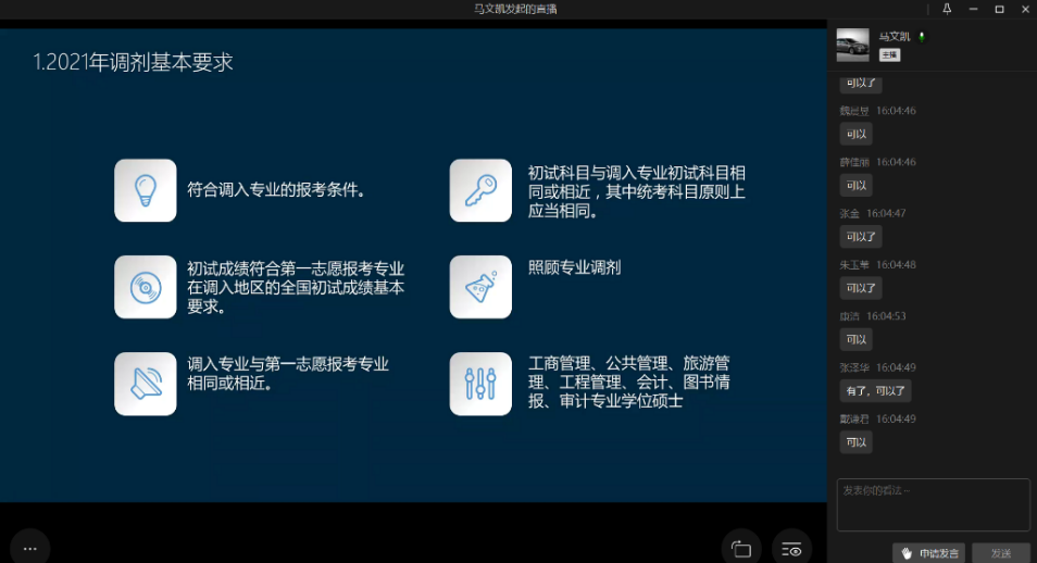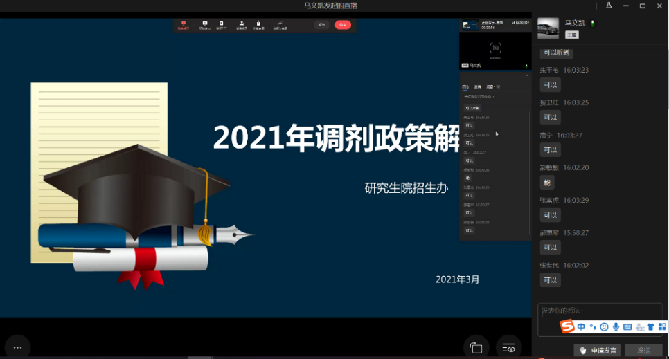 为进一步响应“六稳”“六保”工作要求,落实我校2021年度就业工作会议精神,提高我院学生毕业去向落实率,努力提高我院考研学生的成功率,我院特邀请校研究生工作部马文凯老师为我院学生开展考研复试及调剂技能培训讲座,讲座以线上直播形式开展。