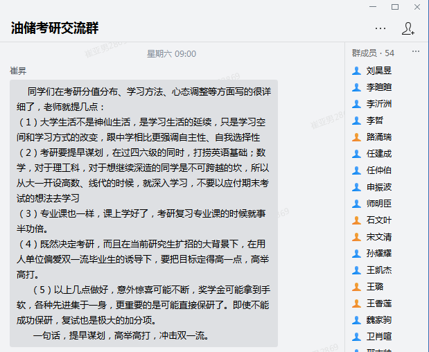 此次交流及动员会中,大家纷纷建议:考研备考要早谋划、早行动、心坚定、用真功、常发力、发长力。希望2019级和2020级学生:一要知考研形势、立高远目标、不盲不茫;二要知自身实际、有合理规划、不躁不乱;三要知备考艰辛、强长跑信心,不退不弃,努力形成“完美大学就是像高三一样奋斗”的思想认识,争取首战必胜,力求实现学院每班级“多考中一人”的目标。