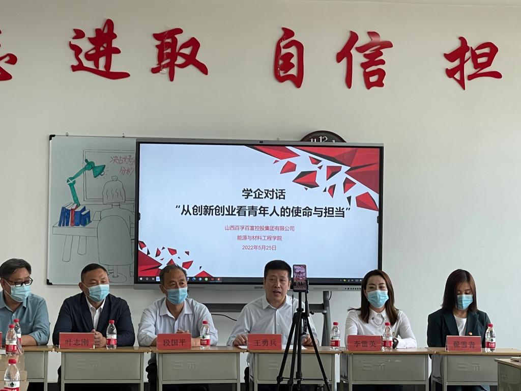 5月25日,太阳成集团tyc122ccvip邀请山西百孚百富控股集团有限公司主要领导与在校毕业生近距离对话交流,开展了“学企对话——从创新创业看青年人的使命与担当”主题座谈会,座谈会采取线上线下相结合的方式举行。学院领导及相关毕业年级辅导员参加了座谈会。