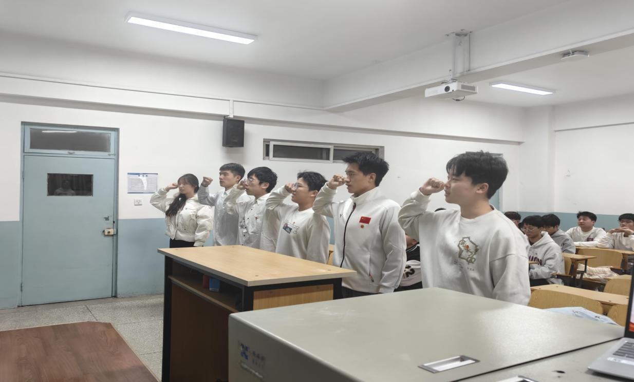 仪式在庄严的国歌声中拉开序幕。主持人吴未希说明了入团仪式的重要意义,并宣布了新团员名单。学生党支部书记王云芳老师、团学辅导员王琦老师和学生党员代表谢鑫同志逐一为新团员佩戴了团徽,颁发了团员证。随后,优秀团员代表陈瑶带领新团员们举起右手并握拳,与右耳齐,拳心向前。领誓人逐句诵读誓词,宣誓人齐声跟读,态度庄严,一同承诺履行团员职责,践行共青团的宗旨。