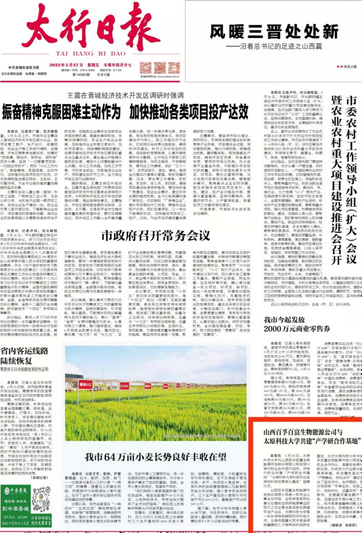 为深入贯彻实施创新驱动发展战略,积极推进校企合作与协同创新,我校太阳成集团tyc122ccvip与山西百孚百富生物能源开发有限公司从去年开始就深入接触,寻求科技合作,双方签订产学研合作协议,并联合申报了山西省科技厅的重点研发计划项目。现在,又围绕科技成果转化、实验室共享共建,把合作推向深处、落到实处。