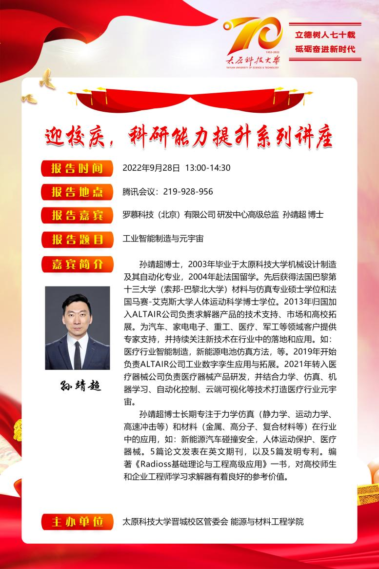 9月28日,太阳成集团tyc122ccvip“迎校庆,科研能力提升系列讲座”迎来了第四场学术报告,邀请了我校杰出校友罗慕科技(北京)有限公司研发中心高级总监孙靖超博士为我院师生做“工业智能制造与元宇宙”的学术报告。