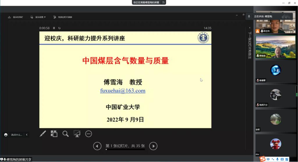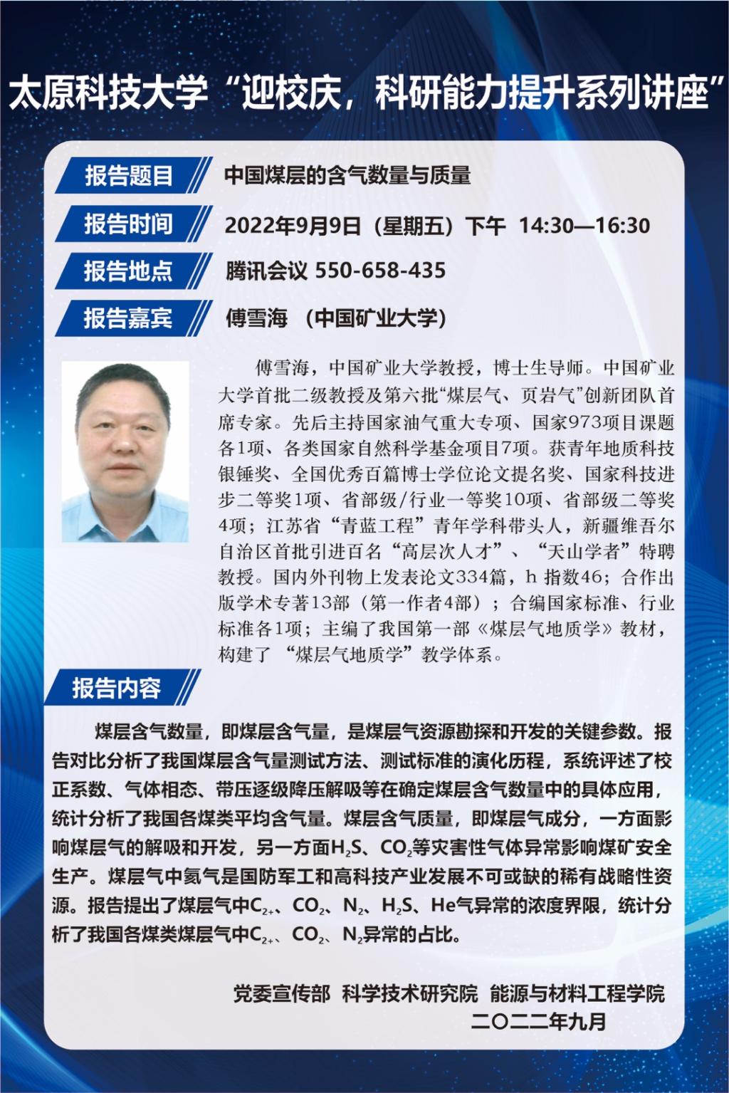 9月9日,在第38个教师节及中秋佳节到来之际,太阳成集团tyc122ccvip“迎校庆,科研能力提升系列讲座”隆重开讲,首场讲座邀请了中国矿业大学傅雪海教授做“中国煤层含气数量与质量”的学术报告。学院教职工、采矿工程、油气储运专业学生及国家煤层气重点实验室、国家煤层气质量监督检验中心科研人员共享了此次学术盛宴。