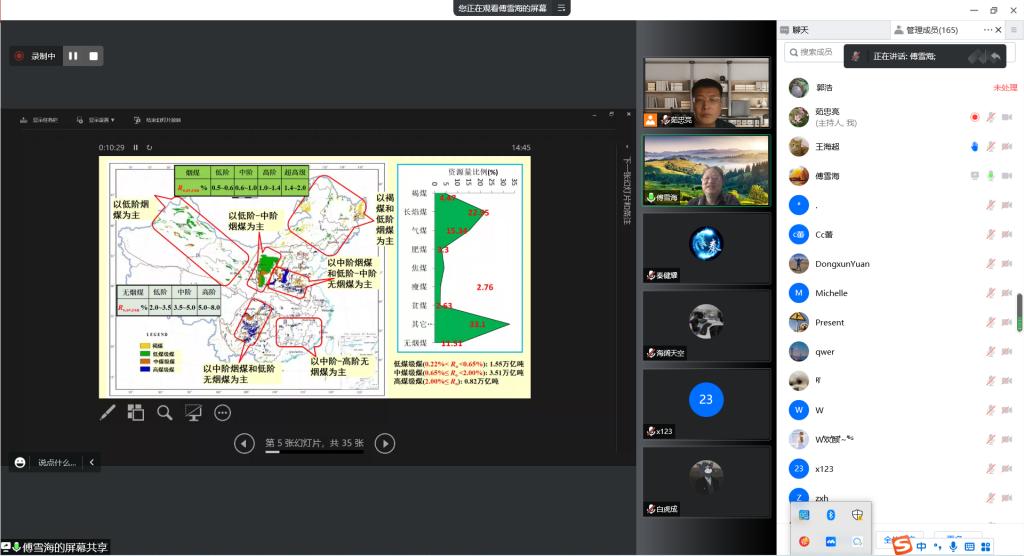 傅教授在精彩的报告中分享了他最新的科研成果,对中国煤层的含气数量测试方法、测试标准的演化历程进行了讲解,系统评述了校正系数、气体相态、带压逐级降压解吸等在确定煤层含气数量中的具体应用,统计分析了我国各煤类平均含气量。同时对煤层气中氦气、氢气、硫化氢等异常气体分布及产生原因进行了分析,报告以详实的数据,丰富的资料展示了傅教授在煤层气地质研究方面取得的丰硕成果。